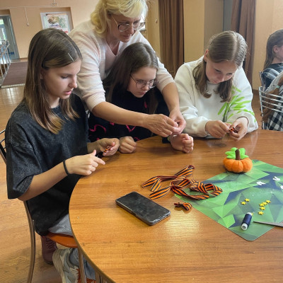 Провела мастер-класс педагог дополнительного образования Терновского дома детского творчества Ирина Николаевна Федотова. Сначала Ирина Николаевна рассказала историю появления Георгиевской ленты, затем участники приступили к изготовлению броши.